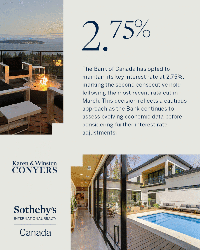 Bank of Canada Interest Rate Announcement: The Bank of Canada has maintained its key interest rate at 2.75%. This is the second consecutive hold after a rate cut in March, indicating a careful evaluation of economic data before further adjustments. Stay informed on how this affects the market with Sotheby’s International Realty Canada.