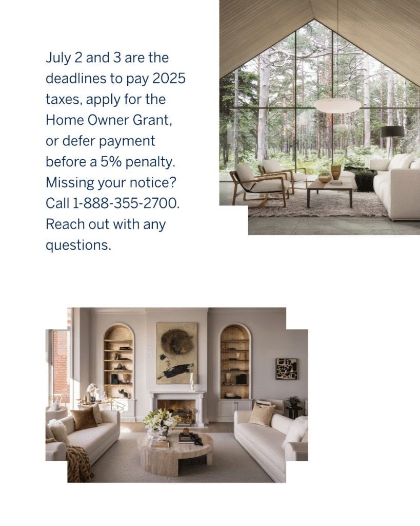 Key Dates to Know for Your 2025 Property Taxes July 2 and 3 mark the final days to apply for the Home Owner Grant, submit or renew your deferment application, and pay your 2025 property taxes before a 5% penalty applies. If you haven’t received your notice, call 1-888-355-2700. Unsure how to pay or whether you’re eligible for deferment? Feel free to reach out and we’ll be happy to help.